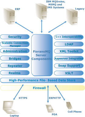 • J2EE连接器架构(JCA)适配器-可与任何J2EE容器双向整合,支持FioranoMQ与应用服务器资源间的分布式事务(XA)。