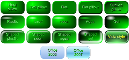 With the latest version of the component, you can now create outstanding 3D buttons having several modern rendering surfaces like Aqua, Gel, Vista's "Aero", Office 2003, Office 2007 and many others: just see below some small surface sample: