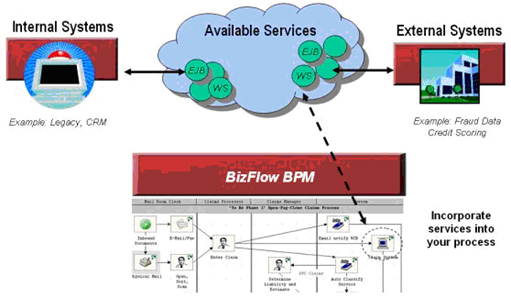 Whether through adaptors or Web services, BizFlow® excels at getting at this data and introducing it into the workflow. With BizFlow® users can create or reuse web services to link application forms to data records. And using out-of-the-box adaptors BizFlow can harness document management systems to enable document imaging, versioning, and archiving.