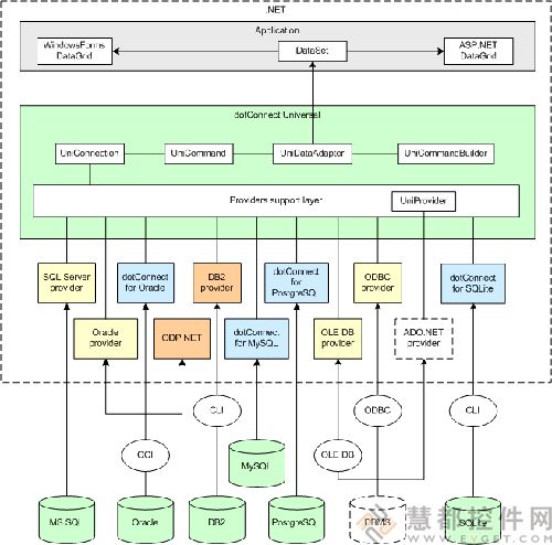 以下的图表展示了dotConnect Universal 的结构。绿色部分表示一些dotConnect Universal组件,灰色面积部分表示在专业版中的提供程序。其余部分表示.NET Framework的内部和外部访问元素。