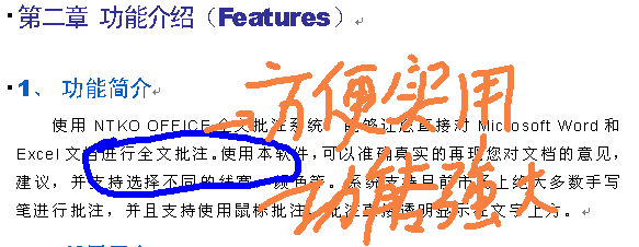 使用NTKO OFFICE全文批注全屏批注,圈阅批注系统,能够让您以所见所得的方式直接对Microsoft Word和Excel文档进行全文批注(全屏批注,圈划批注)。使用本软件,可以准确真实的再现您对文档的意见,建议,及时记录您的灵感。并支持选择不同的线宽,颜色等。系统支持目前市场上绝大多数手写笔进行批注,并且支持使用鼠标批注。批注直接透明显示在文字上方。