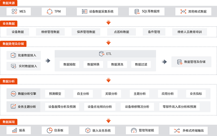 方案提供从数据采集、数据处理、数据分析、数据呈现端到端解决方案,为企业生产、维修和管理提供决策支持。