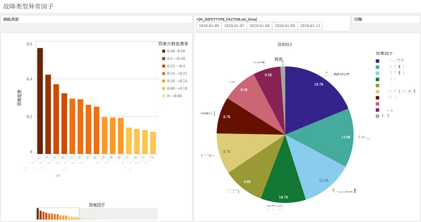 通过产品生产过程中的缺陷记录(人员、设备、订单等)数据进行统计计算,分析相关因子的影响比例,输出因子分析图表。