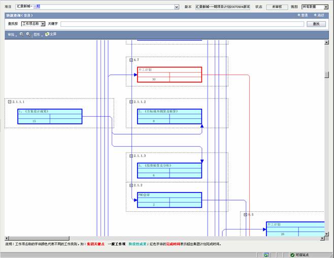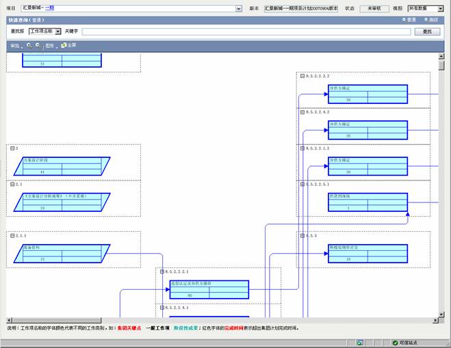 计划编制与调整:对整个项目的工作进行分解,建立WBS工作树,最终将项目分解成工作 任务,并根据每个工作任务的工期、先后顺序、逻辑关系得到项目进度计划,指导项目执行。新项目计划可以引用历史项目的计划模板,通过快速配置得到项目计 划。编制好的项目计划也可以保存为项目计划模板,以供日后编制其它项目计划时引用。