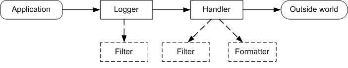 对于程序而言,它的 Logger 对象首先会判断日志的级别是否满足输出级别的要求,然后将满足级别要求的日志消息交给所配置的 Handler 对象来处理,如果日志对象配置了一个 Filter 对象,那么 Filter 对象将会对日志信息做一次过滤。 Handler 对象接受到日志消息后,根据其所配置的格式化类 Formatter 来改变日志的格式,根据所配置的 Filter 对象和 Level 对象来再次过滤日志信息,最后输出到该种 Handler 对象所指定的输出位置中,该输出位置可以是控制台,文件,网络 socket 甚至是内存缓冲区。其架构模型如图 1 所示。