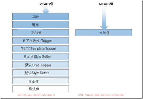 前面废话了这么久,到现在才真正进入今天的主题,对此感到非常抱歉,如果各位不喜欢,可以直接跳到这里阅读。大家都知道WPF带来了很多新的特性,它的一大亮点是引入了一种新的属性机制——依赖属性。依赖属性基本应用在了WPF的所有需要设置属性的元素。依赖属性根据多个提供对象来决定它的值(可以是动画、父类元素、绑定、样式和模板等),同时这个值也能及时响应变化。所以WPF拥有了依赖属性后,代码写起来就比较得心应手,功能实现上也变得非常容易了。如果没有依赖属性,我们将不得不编写大量的代码。关于WPF的依赖属性,主要有下面三个优点,我们的研究也重点放在这三点上: