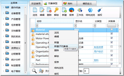 在平台中,可以直接为已有的对象类型添加子类型,子类型可以继承父类型的一切特性。如下图,通过物料类上的右键菜单可以新建子对象类。