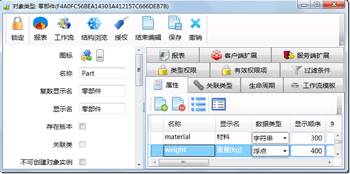 如下图,在制造业企业中,零部件属于一种特殊的物料,在建模的时候,将part建模为material对象类型的子类型。下图显示如何在属性标签页对零部件的属性进行扩展,例子中添加了零部件的“材料”,零部件的“重量”等属性。