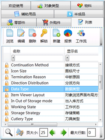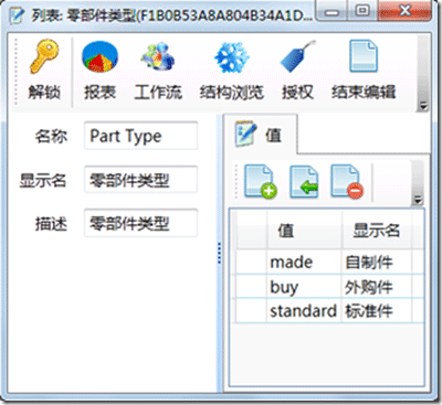 在数据建模时大量存在各类枚举类型,比如“国家”就应该一个枚举类型,其中包括了数百个值,“星期”也是枚举类型,包括从“周一”到“周日”7个值。下图定义了零部件类型所包含的枚举值。