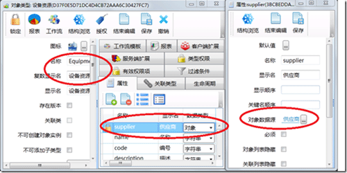 假设系统已定义了供应商类、设备类,在管理管理时需要管理每台设备的供应商,一般来说,一台设备只有一个供应商,而一个供应商可以供应多台设备,则关系建立在设备那边。为“设备”类型添加一个属性“供应商”,其数据源指向“供应商”数据类型。