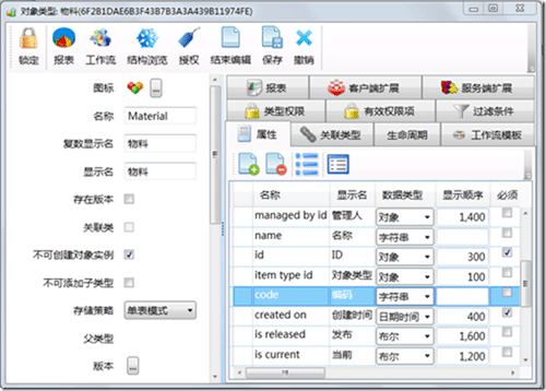 在系统中创建“物料”对象类型,左边可以指定对象类型的基本属性,右边有一系列标签页,可以定义类的属性,类的关联等内容。创建一个类,系统会自动生成一些基本属性,如ID,创建人,创建时间,修改人,修改时间等。在属性标签页可以添加物料的自定义属性,如物料的“编码”、“名称”等。在数据库中将自动按模型生成表Material,用来存储“物料”对象类型的实例数据。
