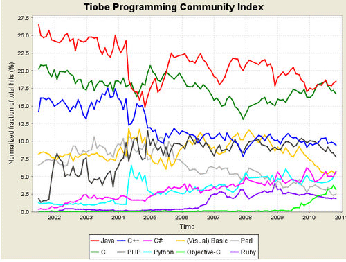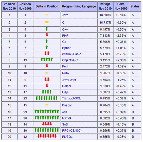 TIOBE编程语言排行榜的11月榜单近日发布。从榜单上可以看出,在过去很长一段时间内都呈现持续增长趋势的Objective-C从上个月开始所占份额第一次有所下降,11月份相比10月又下降了0.5%。这是不是说明iPhone热潮已经开始消退了呢?乐高的Mindstorms编程语言NXT-G首次跻身跃入排行榜的前20名,是11月排行榜一个亮点。同时Google的Go语言突然跌出前20名,Visual Basic由曾经的排行榜之首到本月的跌至低谷,颓废明显,也是11月排行榜值得关注的地方。