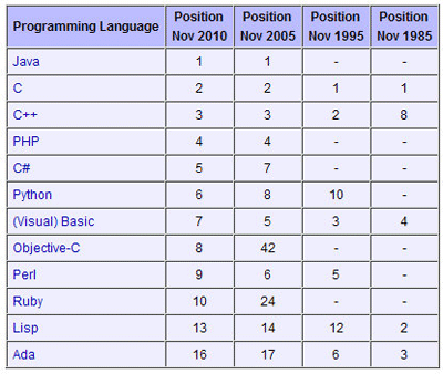 前十名编程语言在5年、10年、15年前的排名情况: