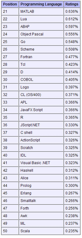 21到50名编程语言排名如下: