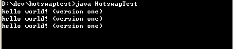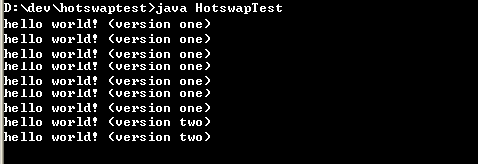 在系统仍在运行的情况下,编译,并替换掉 swap 目录下原来的 Foo.class 文件,我们再看看屏幕的打印,奇妙的事情发生了,新更改的类在线即时生效了,我们已经实现了 Foo 类的热替换。屏幕打印如下: