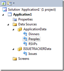 整个解决方案的显示完全屏蔽了传统的那种列出代码的方式(虽然这个解决方案中实际上包含了6个项目,和n多代码文件),而是只显示三个主要的节点:属性,数据源,操作界面。在数据源中,直接创建的数据表,归到了ApplicationData目录下,每个数据表一个节点,不过无法同时打开多个数据表编辑(可能是基于工作的目标更集中,或更方便自动生成代码的考虑)。而引入的外部数据源是另外单列的。