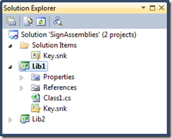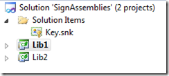 举个例子,假设一个解决方案中具有两个项目:Lib1和Lib2。现在我们需要使用“同一个Key File”对Lib1和Lib2进行签名,Lib1、Lib2和Key File(Key.snk) 对应的目录结构如右图所示:Key.snk和Lib1和Lib2处在相同的目录下面。