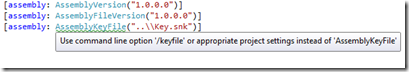 但是,这并不是一种推荐的Key File指定方式。当你添加了AssemblyKeyFileAttribute特性的时候,Visual Studio会有如下一个警告:“Use command line option '/keyfile' or appropriate project settings instead of 'AssemblyKeyFile'”。提示你采用另外两种方案:命令行或者项目设置。