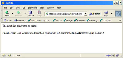 也可以用出错消息为自己服务,因为它们会显示抛出或生成错误的正确代码行。这样,调试就变成在浏览器上查看生成的错误所显示的行号,并在代码中检查这一行。稍后,将会看到 PHPEclipse 插件通过即时地给语法错误加下划线并在保存文件时用红色 “x” 标注语法错误,可在开发和调试过程中提供极大的帮助。