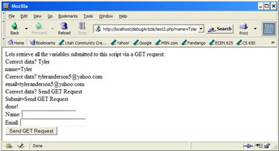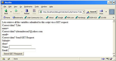 现在单击 Send GET Request 按钮,请注意只有 $_GET 请求的键显示在浏览器上,而正确的值都没显示。可以在循环中放一个 print 语句,检验在 foreach 循环中每个元素中是否确实存在数据。请参阅清单 3。