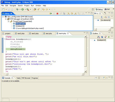 breakpoint() 函数会把缓冲的输出和其他缓冲的数据刷新到 Web 浏览器。对 sleep(.1) 的调用是必需的,这样代码中止于 debugBreak() 之前,服务器才有足够的时间把数据刷新到 Web 浏览器,这个函数是前面下载的 PHP 调试器扩展的内部函数。这样,调用 breakpoint() 会把 HTML 块、print() 和 echo() 语句的数据刷新到浏览器,然后中止代码执行。