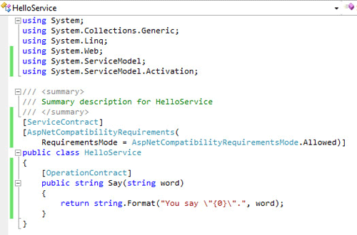 2. 在HelloService.cs中添加一个方法,再加上一些WCF的设置,如下图:
