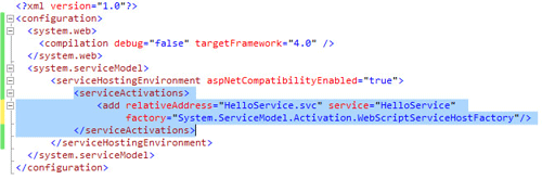 3. 继续在web.config增加设置,在system.serviceModel/serviceHostingEnvironment中增加serviceActivations,如下图:
