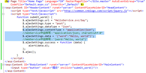 需要注意的地方是上图中加背景的地方,contentType与data,与WebService的不同之处已在注释中说明。