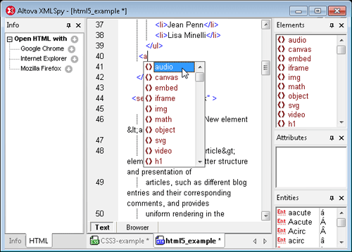 XMLSpy一直以来都支持HTML4和XHTML编辑,甚至包括一个智能型的CSS编辑器。XMLSpy 2012版本引入了智能支持,即编辑HTML5时的智能代码提示。XMLSpy HTML5 编辑器在静态化输入助手窗口和下拉菜单中提供了上下文敏感编辑帮助,你可以轻松地在XMLSpy HTML5 编辑器中编写代码。另外,代码完成有助于加快编辑以及确保关闭元素。