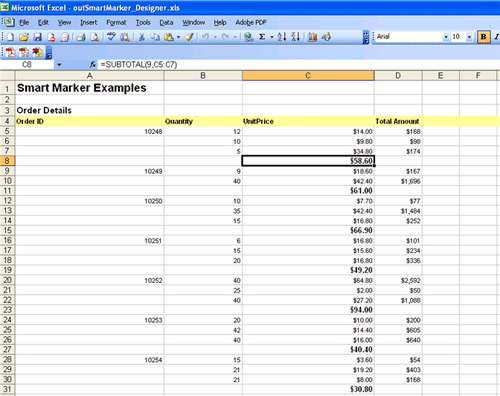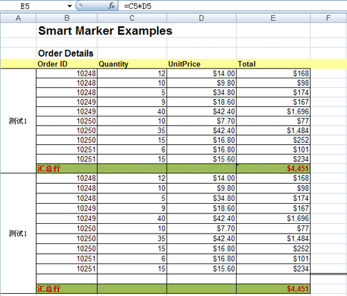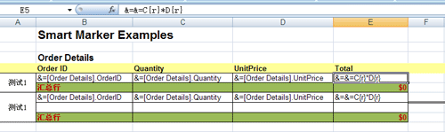 报表2的模板如下所示,对象也可以通过&=[Order Detail]方式引用,另外模板支持一些参数,其中{r}为当行的变量,翻译到实际的报表可能就是C4*D4这样的格式了,其中两个&=表示动态公式引用,区别于普通的变量和字符,如&=&=C{r}*D{r}后者汇总函数&=&=Sum(C{r}:D{r})等等。