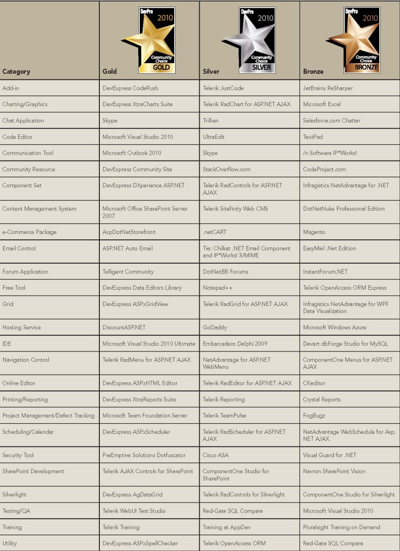“2010 Community Choice Awards”是由国外权威开发者网站DevProConnections发起的,用于评选本年度最受欢迎的开发工具和产品的活动。此次评选活动总共有2300位DevProConnections网站成员参与投票,选择他们最喜爱的开发工具和产品。参选的产品有26类,包括插件,代码编辑器,内容管理系统,托管服务以及各种各样的控件和组件产品等。