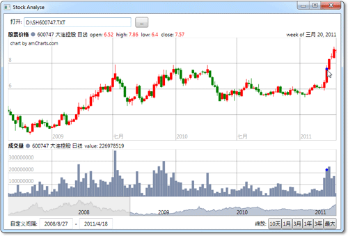 本想自己用GDI绘图, 通过数据直接绘制一张蜡柱图, 但觉得这样子的功能比较少, 所以到网上搜索一些能画出K线图的控件. 发现DynamicDataDisplay挺好的, 在它的开发截图里也发现可以绘制蜡柱图, 但文档好像做的不是很好, 不知道怎么用它来画, 在寻找它比较好的例子的时候发现有人推荐用amCharts绘制, 所以便去看了一下, 发现挺好用的, 效果如下: