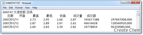 至此, 关于控件的界面方面就是这些内容. 上面提到了绑定了程序里的Data, 这个Data是怎么来的呢? 数据是从国信金太阳网上交易专业版里下载的日线数据, 这个数据格式还是比较有规则的, 第一行表示股票信息, 第二行表示数据类型, 接下来就是数据了, 每个数据之间用\t制表符分隔开.