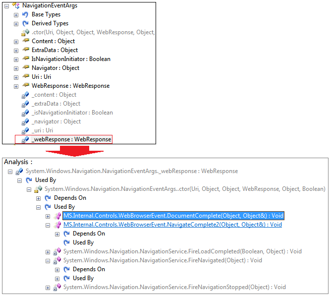 在NavigationEventArgs类中的_webResponse成员实际就是我们要分析的对象,他仅由NavigationEventArgs的构造函数调用。而从他的构造函数的被调用列表中,我们发现了两类方法,一类是被定义在MS.Internal.Controls.WebBrowserEvent中的,还有是定义在System.Windows.Navigation.NavigationService中的。当然,我们可以想到,第一类是所谓WebBrowser控件的内部组件类,这个类实际就是所谓架构中对于ShDocVw.dll的一次.Net封装。所以这个类的方法就是WebBrowser在Navigated的时候调用的。点击显示MS.Internal.Controls.WebBrowserEvent.NavigateComplete2方法的逻辑代码: