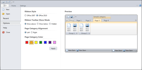 当使用后台查看作为Ribbon控件的应用程序菜单的一部分时,不受BackStageView控件所施加的限制。BackStageView控件不仅可以与DXRibbon控件进行整合和使用,还可显示为一个独立的控件。如果你想在你的程序中创建一个模仿Backstage查看行为的用户界面或者“起始页”,它就显得非常有用了。