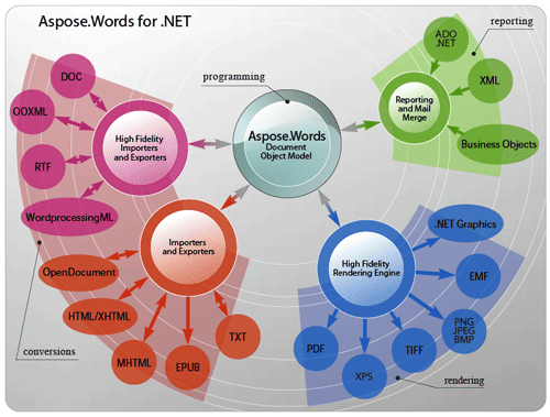 Aspose.Words, 是Aspose“家族类库” 之一。除这个以外,还有其他许多厉害的类库例如Aspose.pdf(操作PDF文件的类库)、Aspose.Flash(操作 Flash文件的类库)、Aspose.report(操作报表的类库)等等,大家有兴趣的可以上官方网研究下。这些类库都包含两种语言,一种是java ,另一种是.NET.这里主要是介绍Aspose.Words for .NET。Aspose.Words for .NET功能非常强大,您不需要安装office组件,都可以用这个来生成word文档。Aspose.Words支持 DOC,DOCX,OOXML,RTF格式,HTML格式,OpenDocument格式,PDF格式,和其他格式 。从下面图中,大家可以更加详细的了解Aspose.Words的架构。有一点忘了提,这套类库是收费的,在本文后面我会提供一个破解版的下载地址给大家的。