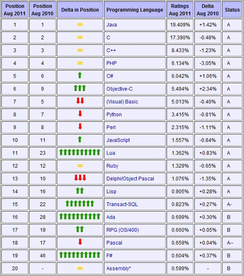 最终,一种新的函数型编程语言进入了Top 20.大多数人会认为热门函数型编程语言像Scala (#66), Clojure (#107), Haskell (#35) 或者是 Erlang (#48)等将会成为所有函数型编程语言的鼻祖Lisp的劲敌。但结果似乎是微软的语言F#,不过看看最近人气上升的F#,就没有什么好奇怪的了。作为一 种不错的程序设计语言,微软最新的Visual Studio 2010中也包含了F#。