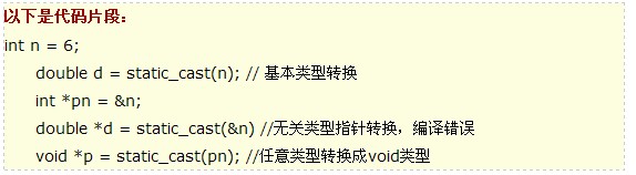 2. 基本数据类型转换。enum, struct, int, char, float等。static_cast不能进行无关类型(如非基类和子类)指针之间的转换。