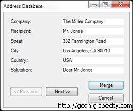 在【Address Database】窗体中添加一个【Print】按钮,当点击【Print】按钮时,程序会将数据源中的记录合并到文档中并进行打印操作: