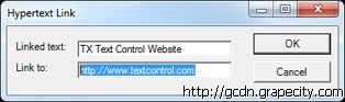 在第二个示例程序中,添加了一个对话框,这样就可以更方便的创建超链接。除此之外,还可以对之前插入的超链接进行编辑和修改。需要注意的是,超链接通常是和 HTML文件相关联,不过超链接还可以保存在RTF、微软Word文件以及TX Text Control格式的文件中。
