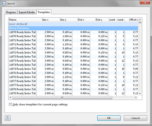 5、通过Project > Page Setup来选择标签格式。在"Templates"标签中,从预定义的标签格式中选择你想要的标签模板。该模板自动设置了各个标签的大小,出现在页面上的标签数量以及分布。