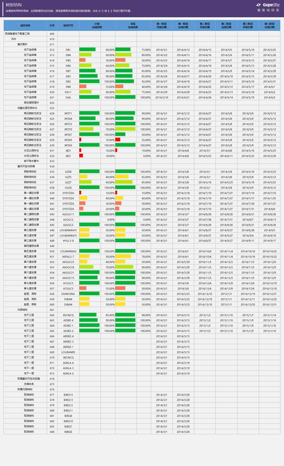 使用葡萄城报表控件——ActiveReports ,可轻松设计树形结构报表,实现维度钻取功能以及设置进度条显示等功能,可快速查看更细粒度的指标数据,如项目施工进度报告等。
