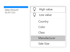 如果您选择高值或低值进行扩展,标题旁边还会看到一个灯泡,提示您Power BI正在为您动态选择该字段,并且该字段会随着数据刷新而更新和更改。连接线也是虚线,作为另一个视觉提示。