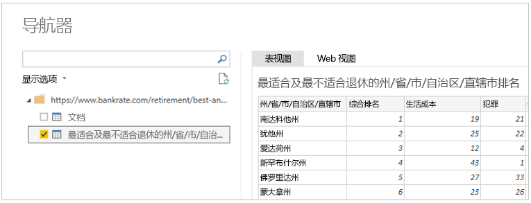 连接后,看到的第一个窗口将是“导航器”。“导航器”窗口显示数据源的表或实体,选择表或实体可预览其内容。然后,可以立即导入所选的表或实体,也可以选择“编辑”,在导入前转换和清理数据。