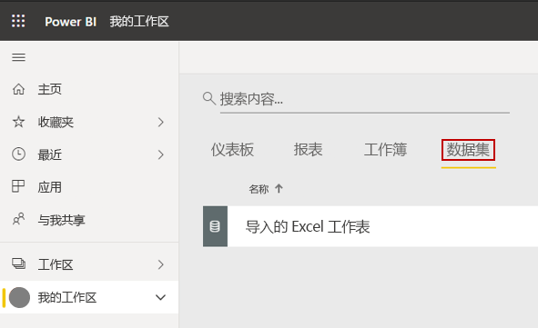导入工作簿的数据后,将在Power BI中创建一个数据集,该数据集将显示在“数据集”下。