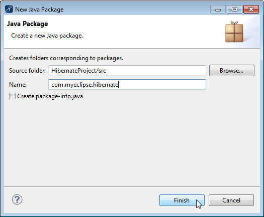 单击“Java Package”字段旁边的“新建”以为session factory类创建新的软件包。键入com.myeclipse.hibernate作为程序包名称,然后单击“完成”。