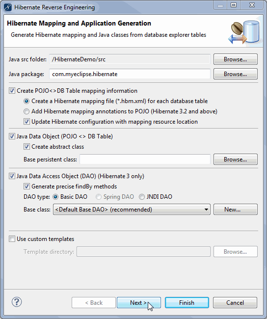 | Java src文件夹 | 生成映射文件、pojo和DAOs的项目和源文件夹。 |
