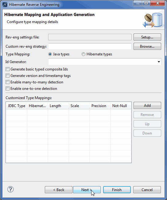 | 类型映射 | 确定在字段映射的type属性中使用Java还是Hibernate类型,例如java.lang.String vs. string。(仅在此向导第3页的“Customized Type Mappings”列表中找不到更特定的设置时,才使用此设置。) |