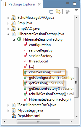 测试Hibernate持久性的一种方法是使用main方法创建Java类。测试类使用Java对象和由Hibernate向导创建的HibernateSessionFactory。查看在HibernateSession类中定义的两个重要方法,如下所示,它们在测试代码中使用。