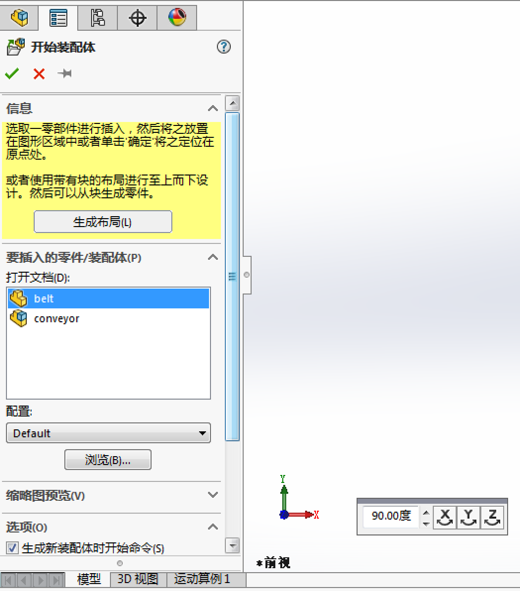 当您生成装配体时,选择打开,开始装配体PropertyManager。如果您的第一个装配体任务为插入零部件或生成布局之外的普通事项,清除选择。